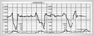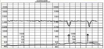Замедления фиксируются через 30 секунд после пикового сокращения матки и длятся дольше самих схваток. Такие изменения в норме быть не должны и сигнализируют о нарушении кровообращения в плаценте. Если отсутствуют другие факторы, степень замедления зависит от иннервации, вызванной интенсивными маточными сокращениями.