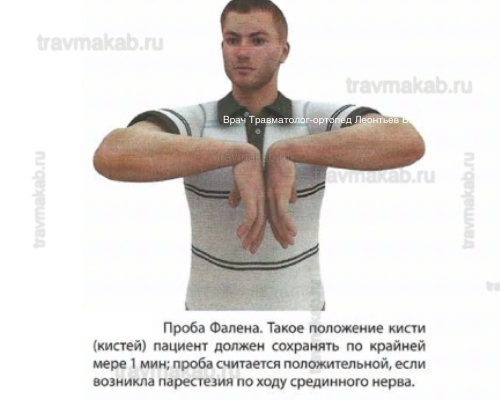 Симптомы синдрома запястного канала (СЗК) можно выявить при осмотре с помощью постукивания по срединному нерву (симптом Тинеля) или проведении пробы Фалена.