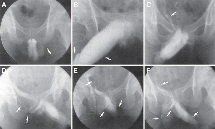 Венозная утечка в кавернозных телах, исследованная с помощью кавернозографии, показывает разные типы утечки: (A) поверхностная венозная утечка; (B) глубокая венозная утечка; (C) краральная венозная утечка; (D) кавернозная утечка; (E) венозная утечка между половым членом и уретрой; (F) смешанная венозная утечка.